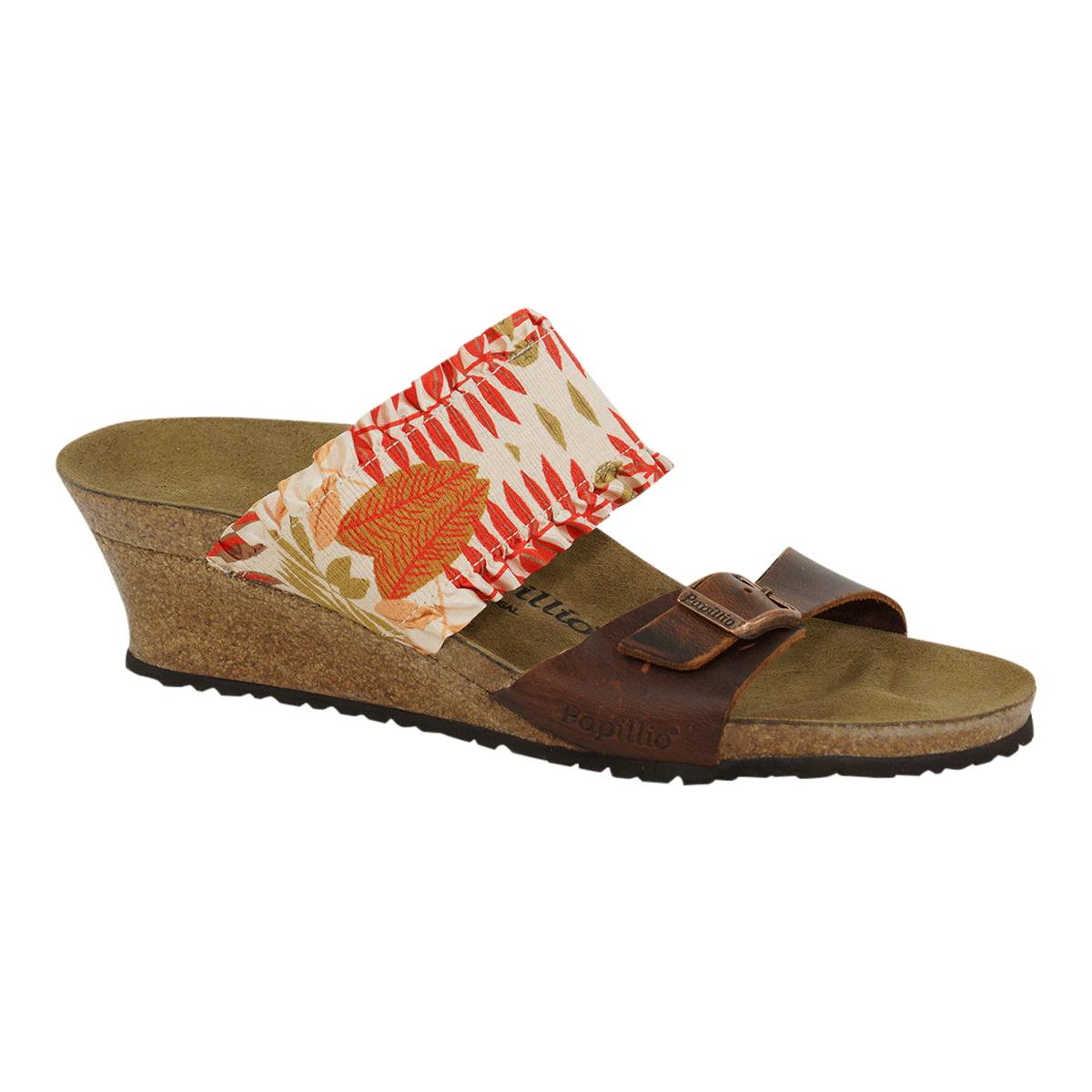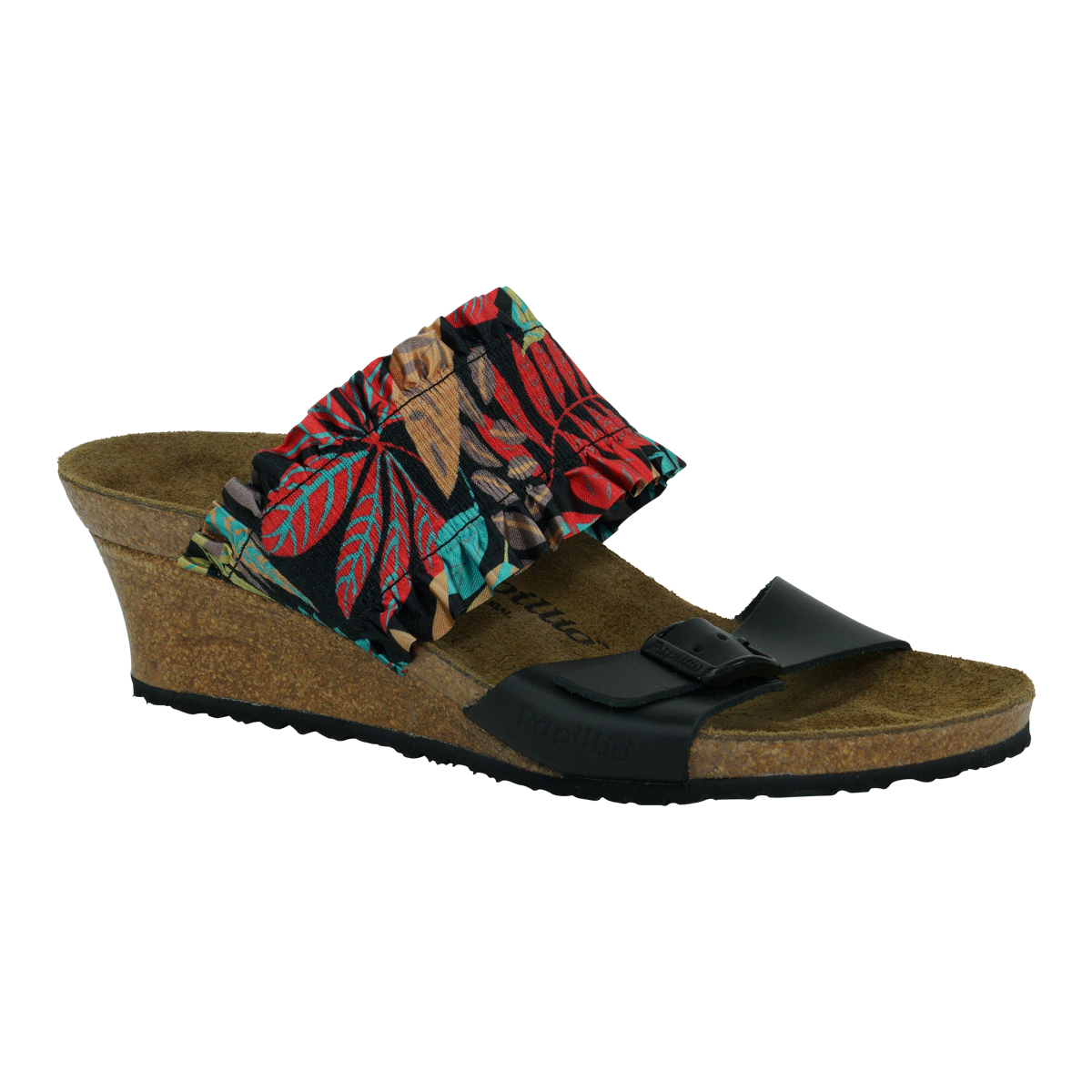 Product FeaturesThe Della From Papillio - a new wedge mule with two straps: a thick elastic/fabric top strap and a thinner, adjustable leather strap with buckle closure. A multicolored floral print and playful frills make for a bold summery look.
