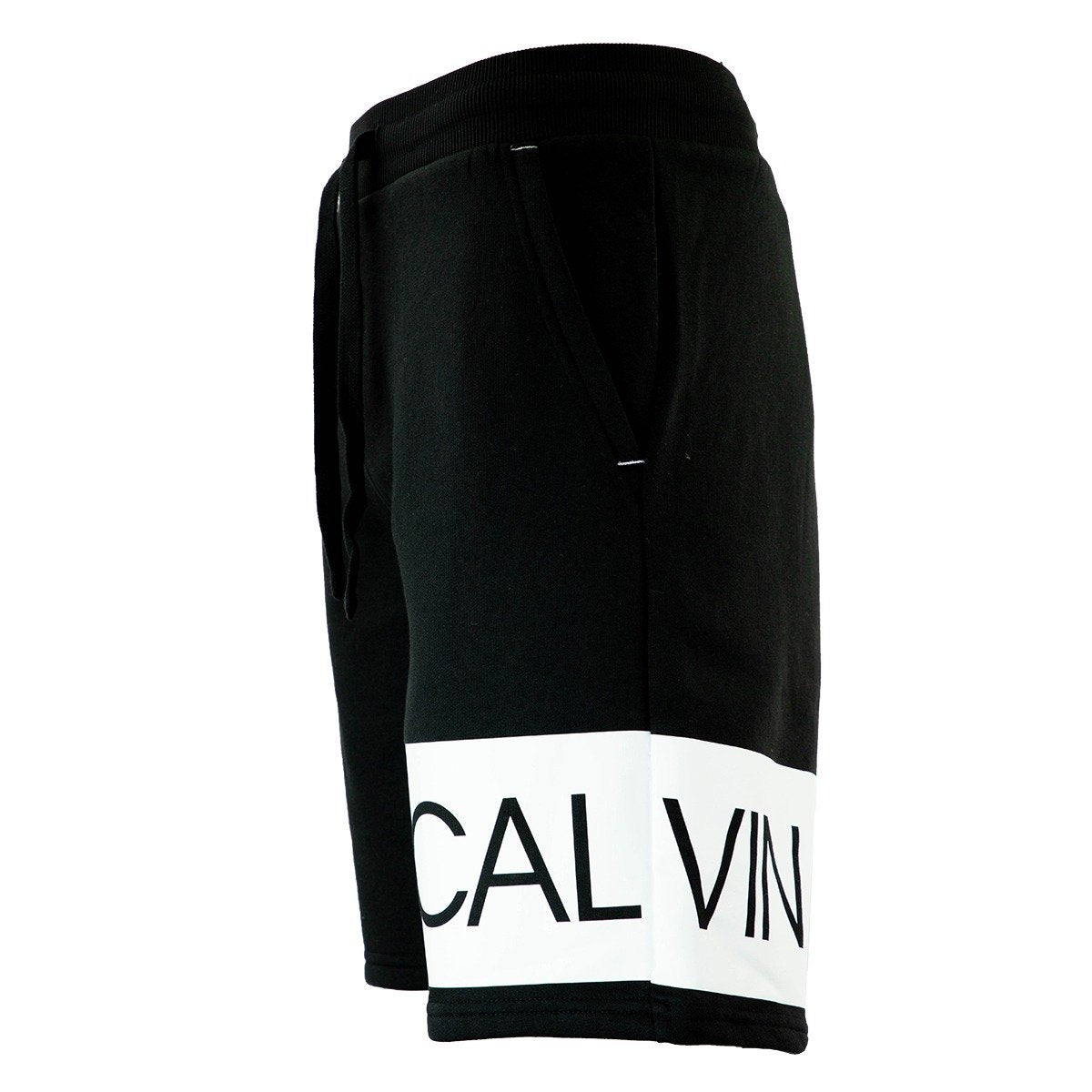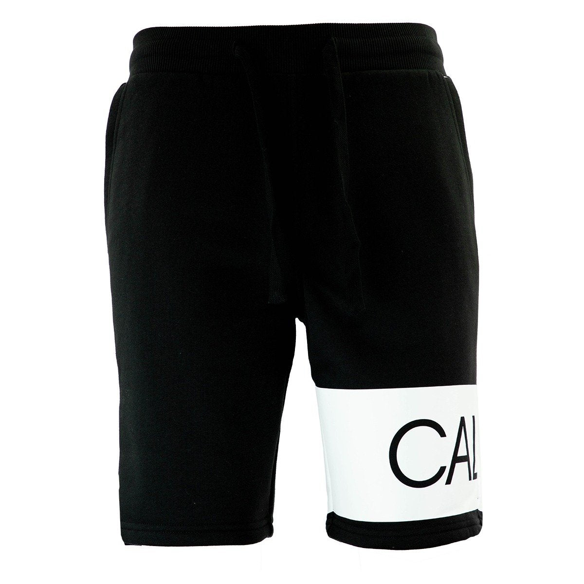 Innovative and chic colorblocking decorates a pair of fleece shorts with a brand logo print for a sporty chic attire